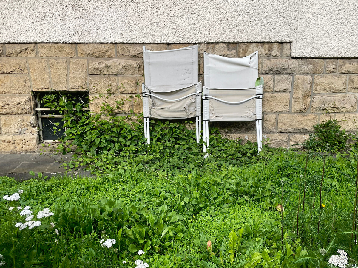 White chairs leaning on a wall, Luxembourg.