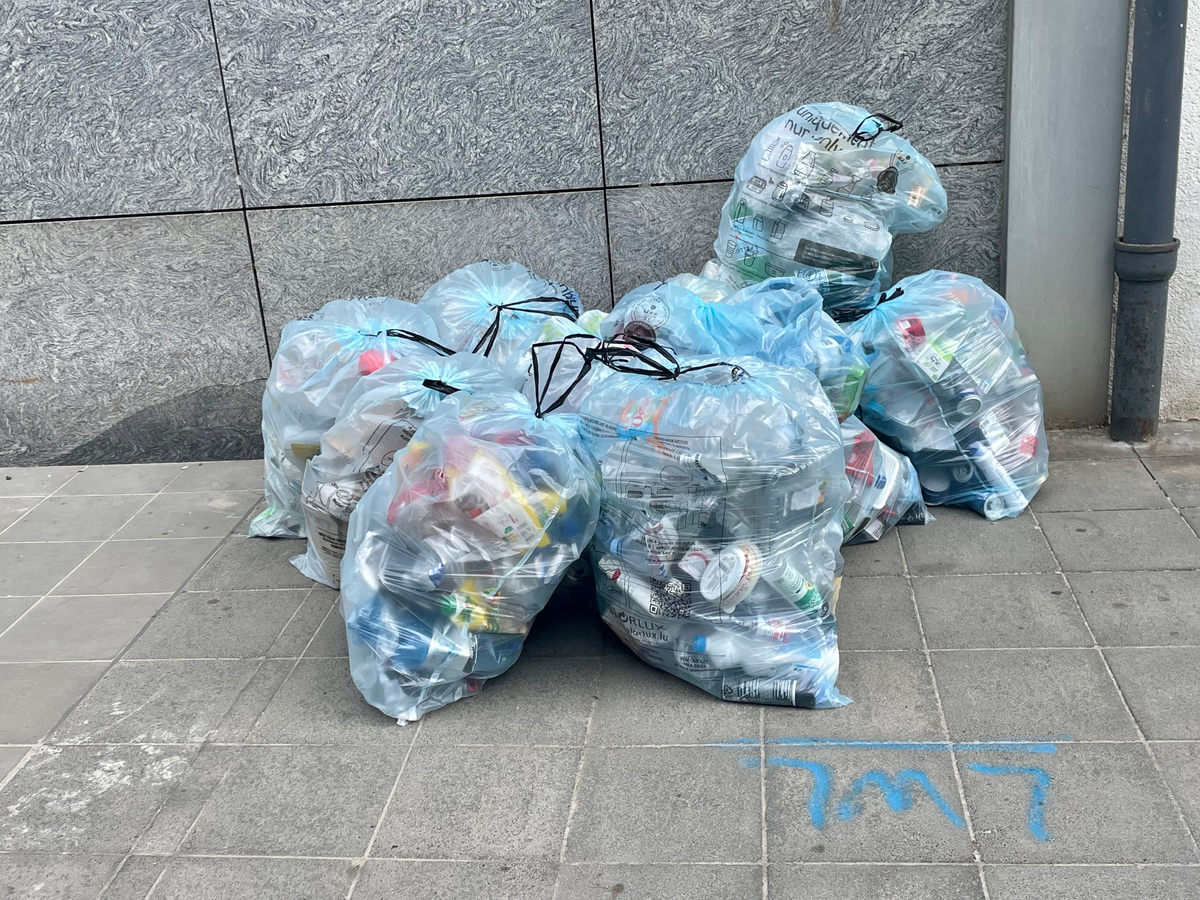 4 large Valorlux sacs bleus on the pavement against a window, in Luxembourg.