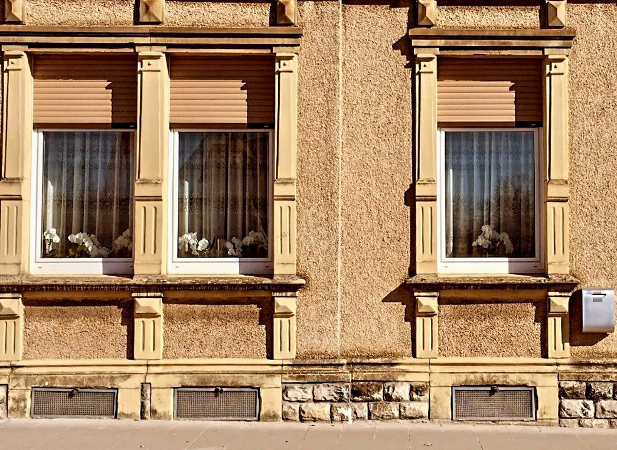 3 windows of a yellow house in Luxembourg.